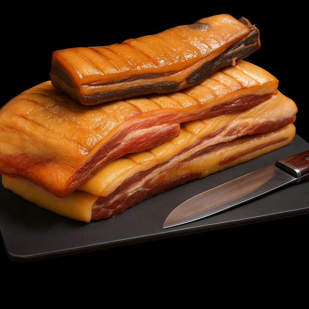 Slănină afumată tradițională, pregătită după metoda autentică de la țară: sărare corectă, maturare lentă și afumare naturală cu lemn de fag si cires.